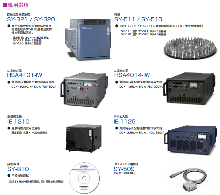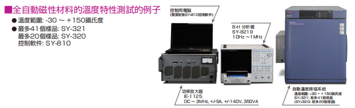 | 测试项目 | 特性值: B-H 测试: 更大磁通密度(Bm)、剩磁(Br)、更大磁场强度(Hm)、矫顽力(HC)、 矫顽比(Br/Bm)、振幅比磁导率(μa)、功率损耗(Pc、Pcv、Pcm)、 电流电压相位差(θ)、总磁通变化(2φm) Pc 测试: 更大磁通密度(Bm)、剩磁(Br)、更大磁场强度(Hm)、矫顽力(Hc)、 振幅比磁导率(μa)、功率损耗(Pc、Pcv、Pcm)、电流电压相位差(θ)、 视在功率(VA) μ 测试: 更大磁通密度(Bm)、更大磁场强度(Hm)、阻抗磁导率(μz)、 复数磁导率(μ'、μ")、振幅比磁导率(μa)、功率损耗(Pc)、 电流电压相位差(θ)、损耗系数(tan δ)、电感值(L)、电阻值(R)、阻抗值(Z)、品质因数(Q) | |