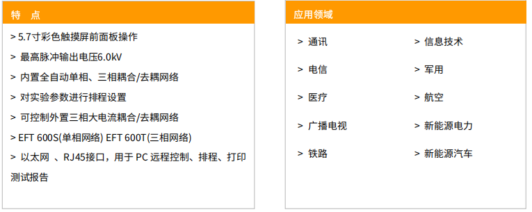 工业测量或控制设备中经常使用常见的控制单元,它们会包含继电器或者一些机械开关设备。使用公共供电系统的 通常是日光灯镇流器,或一些小功率电器。这些电器都是电感负荷的,在开关时就会产生干扰。电快速瞬变现象会引起 微处理器发生故障或重置,不能进行正常操作。 EFT 600系列智能型电快速瞬变脉冲群模拟器是按照电气、电子产品对 于电快速瞬变脉冲群试验的特点和要求而专门设计的,具有用于单相或三相被测设备主机供电线路的内置耦合/去耦网络, 具有可靠性好、性能稳定、使用方便等特点。