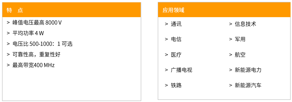 TFB500/TFB1000为50Ω终端负载和1kΩ终端负载,符合EN/IEC61000-4-4,可承受更高8KV的脉冲电压,工作带宽400 MHz。