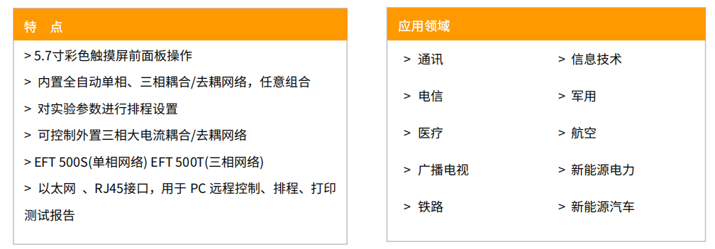 工业测量或控制设备中经常使用常见的控制单元,它们会包含继电器或者一些机械开关设备。使用公共供电系统的通常是日光灯镇流器,或一些小功率电器。这些电器都是电感负荷的,在开关时就会产生干扰。电快速瞬变现象会引起微处理器发生故障或重置,不能进行正常操作。EFT 500系列智能型电快速瞬变脉冲群模拟器是按照电气、电子产品对于电快速瞬变脉冲群试验的特点和要求而专门设计的,具有用于单相或三相被测设备主机供电线路的内置耦合/去耦网络,具有可靠性好、性能稳定、使用方便等特点。