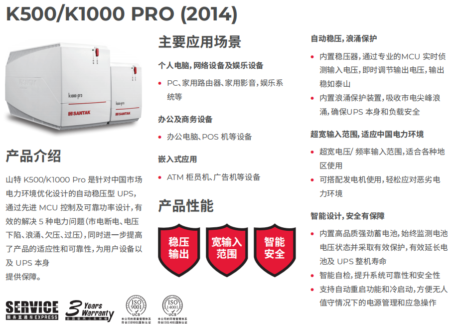 山特K500/K1000 Pro 是针对中国市场电力环境优化设计的自动稳压型UPS,通过先进 MCU 控制及可靠功率设计,有效的解决5种电力问题(市电断电、电压下陷、浪涌、欠压、过压),同时进一步提高了产品的适应性和可靠性,为用户设备以及UPS 本身提供保障。