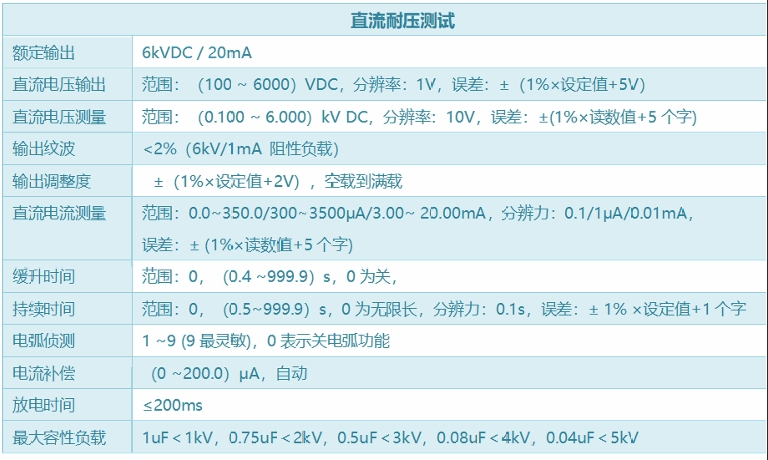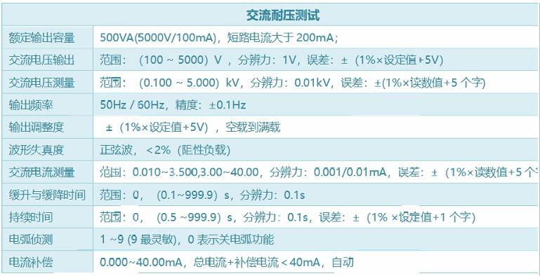 功能完备:测试项目包括交直流耐压、绝缘电阻、接地导通电阻、泄漏电流、电弧侦测、开路侦测等。