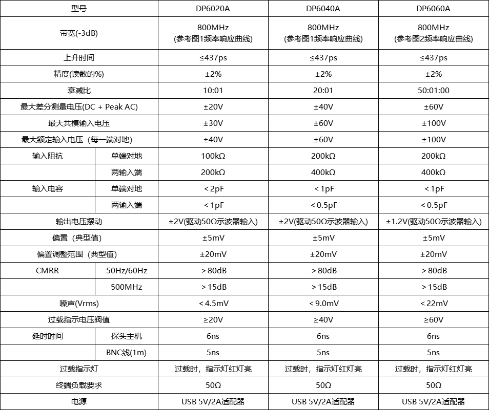 DP6020A、DP6040A和DP6060A探头是具有浮地测量功能的低压差分探头。测量电压分别±20V(DC+Pk)、±40V(DC+Pk)和±60V(DC+Pk),其带宽高达800MHz,提供 10:1 、20:1和50:1的衰减设置,具有 200KΩ和400KΩ 的输入阻抗,以及 1 pF和0.5pF 的低输入电容,可以更大程度地降低电路负载;具有过压报警功能,可以兼容任何具有 50 Ω BNC 输入的示波器,并可以通过示波器或计算机上的 USB 端口供电。在各种应用中得到广泛使用,可以为当今的高速功率测量、车载总线测量和数字系统设计提供出色的通用差分信号测量。