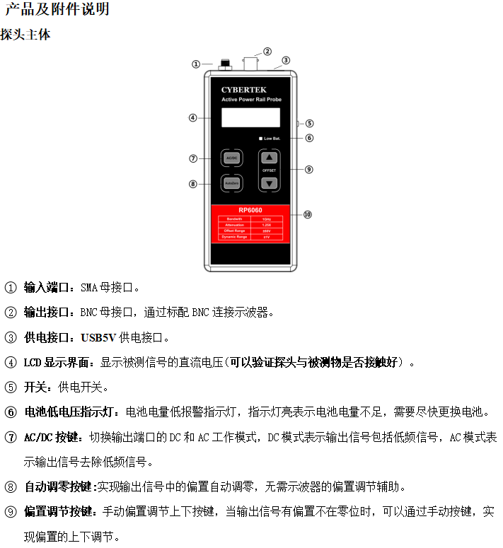 RP6060探头为测量 DC 电源轨上的纹波而提供低噪声、大偏置范围解决方案,其 DC 电源轨范围为 -60 ~ +60 VDC。提供了所需的行业领先的低噪声和大偏置范围,可以测量1GHz 以下200μVp-p ~ 800 mVp-p的AC 纹波。该探头主要用于测量配电平面的低源阻抗,所以不建议在源阻抗 >1 Ω 的情况下测量设备,因为这可能会导致波形失真。