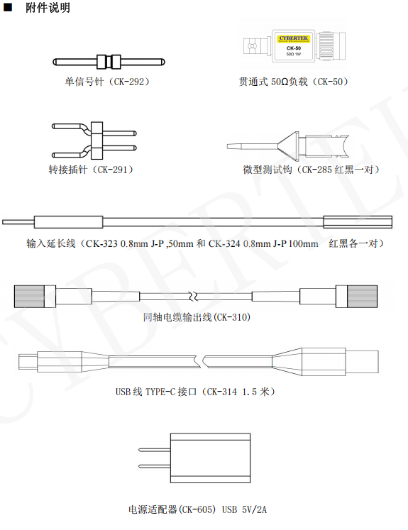 ④电源接口:标准的 USB TYPE-C 接口,通过标配的 USB 适配器供电;也可以通过示波器供电,使用方便。