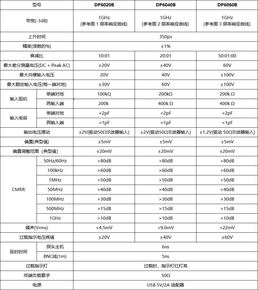 DP6020B、DP6040B 和 DP6060B 探头是具有浮地测量功能的低压差分探头。测量电压分别± 20V(DC+Pk)、±40V(DC+Pk)和±60V(DC+Pk),其带宽高达 1GHz,提供 10:1 、20:1 和 50:1 的衰减设置, 具有 200KΩ和 400KΩ 的输入阻抗,以及 1 pF 的低输入电容,可以更大程度地降低电路负载;具 有过压报警功能,可以兼容任何具有 50 Ω BNC 输入的示波器,并可以通过示波器或计算机上的 USB 端口供电。在各种应用中得到广泛使用,可以为当今的高速功率测量、车载总线测量和数字系 统设计提供出色的通用差分信号测量。