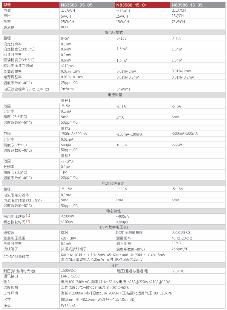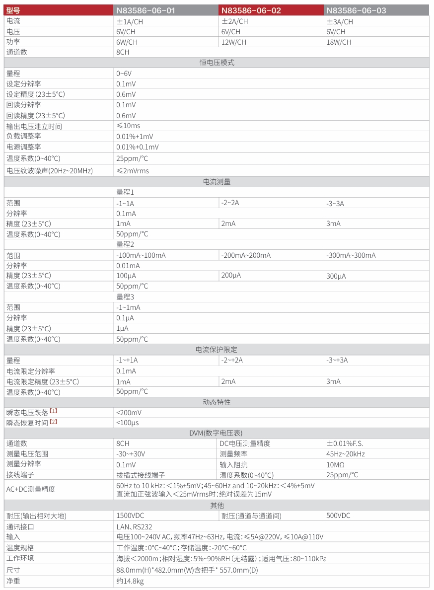 N83586系列为一款小功率、高精度、多通道的可编程电池模拟器。采用双象限设计,电流可充可放。N83586系列单机8个通道,通道间相互隔离,方便多通道串联使用,满足BMS测试、消费类电子产品ATE测试应用;支持8路高精度DVM,支持AC+DC有效值测量,测量范围-30V~+30V;