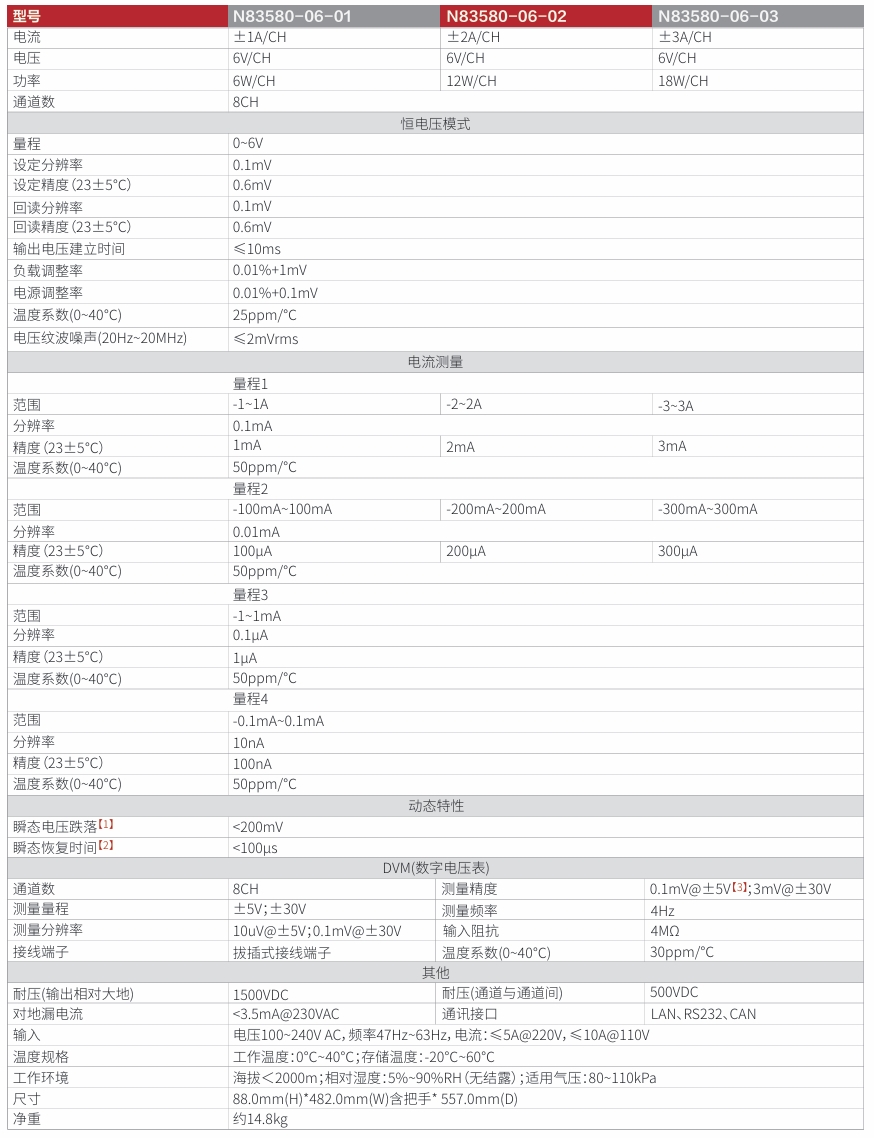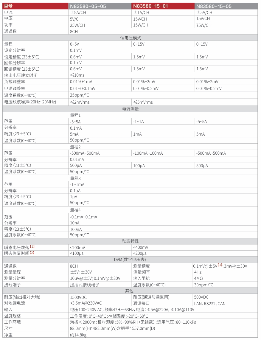 N83580系列为一款小功率、高精度、多通道的高性能可编程电池模拟器。采用双象限设计,电流可充可放。N83580系列单机8个通道输出,并支持8路高精度DVM,DVM精度达0.1mV,通道间相互隔离,方便多通道串联使用,不仅可满足BMS测试需求,还可满足消费类电子产品ATE测试;