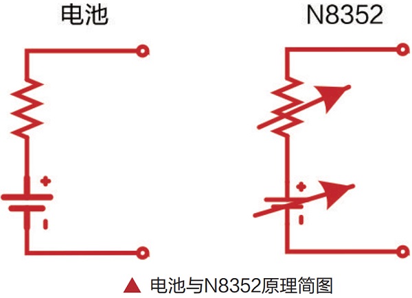 N8352具备电池内阻模拟功能,并支持内阻值可编程,可编程范围为:0-20Ω,可模拟与真实电池内阻特性一致的变化曲线。N8352与电池在原理上如图所示: