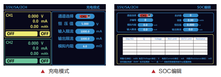 电源模式:作为两通道电源使用,可以设定输出电压以及输出限流值,根据负载状态自动切换恒压模式或者恒流模式,多个电流量程,提高输出与测量准确度。