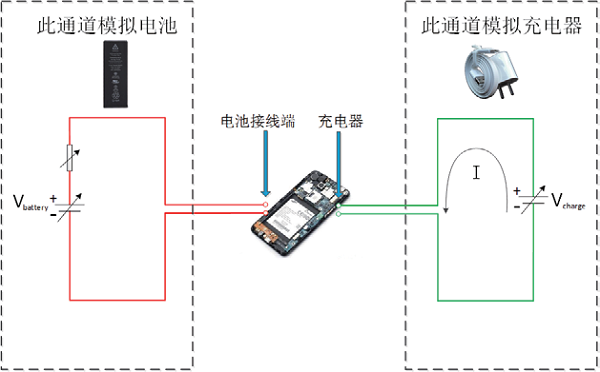 N8352两个通道电流均可充可放,因而可将任一通道作为电源,另一通道模拟电池,分别连接至被测手机的电源端与电池端,无需更改接线,即可测试手机电池充放电性能。使用单台机器便可实现对一块充放电保护板的测试,无需额外的开关切换,极大的简化测试系统复杂度,提高测试的稳定性和效率。