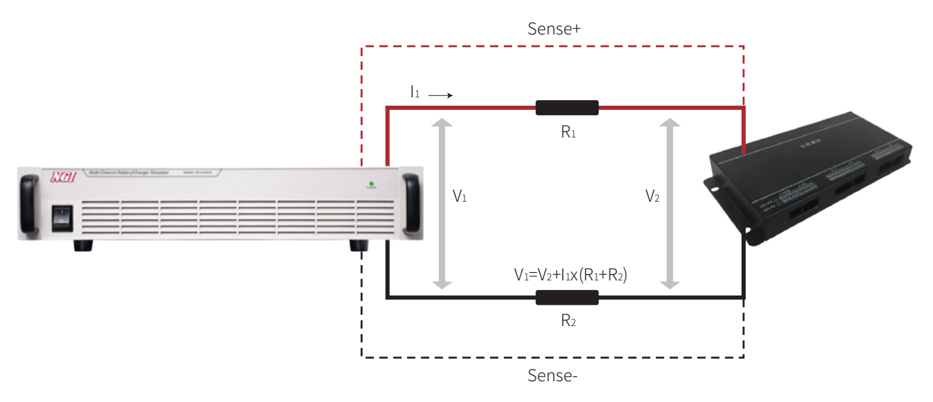 为了保证对被测设备提供的电压,N8330系列产品采用四线制接法,即两线用于输出电压,另外两端直接测量 被 测 设 备 电 压 。通 过 S E N S E 端 测 量 线 能 消 除 电 源 到DUT之间因引线电阻而引起的电压降。