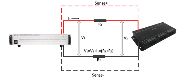 为了保证对被测设备提供的电压,N8330系列产品采用四线制接法,即两线用于输出电压,另外两端直接测量被测设备电压。通过SENSE端测量线能消除电池模拟器到DUT之间因引线电阻而引起的电压降。