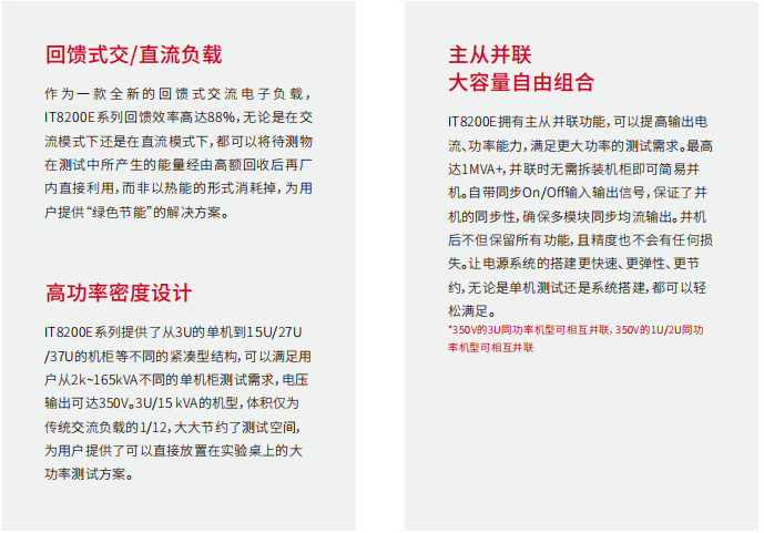 IT8200E系列展现了高效回馈式可编程交直流电子负载的先锋技术,能够无污染地将电能高效回馈至电网,既节能又 环保。在紧凑的3U机框内,它提供高达21kVA的功率,且利用主从并机技术,功率可轻松扩展超过1MVA。