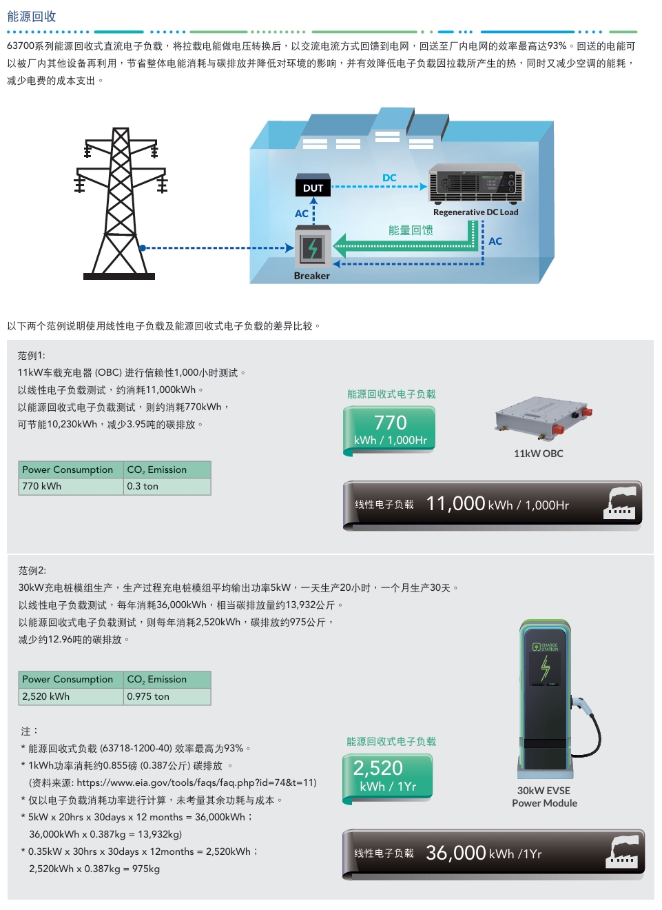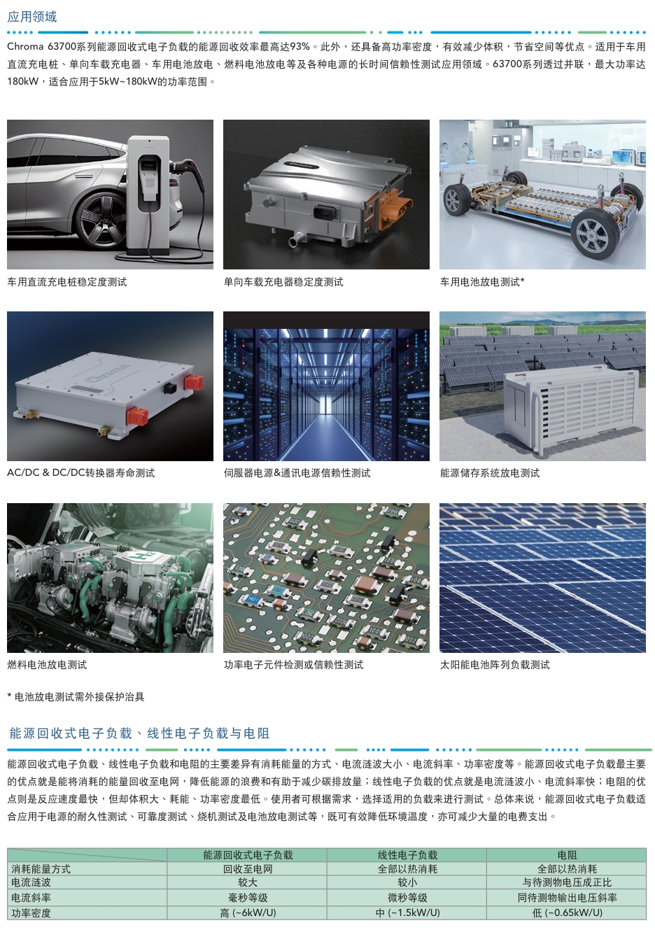 63700系列能源回收式直流电子负载,适用于电动车电池放电、燃料电池放电、大功率电源老化、直流充电桩、单向车载充电器可靠性、燃料电池发动机系统、储能系统、AC /DC与DC/DC电源供应器、功率电子元件及电力电子元件等产品信赖性测试使用.