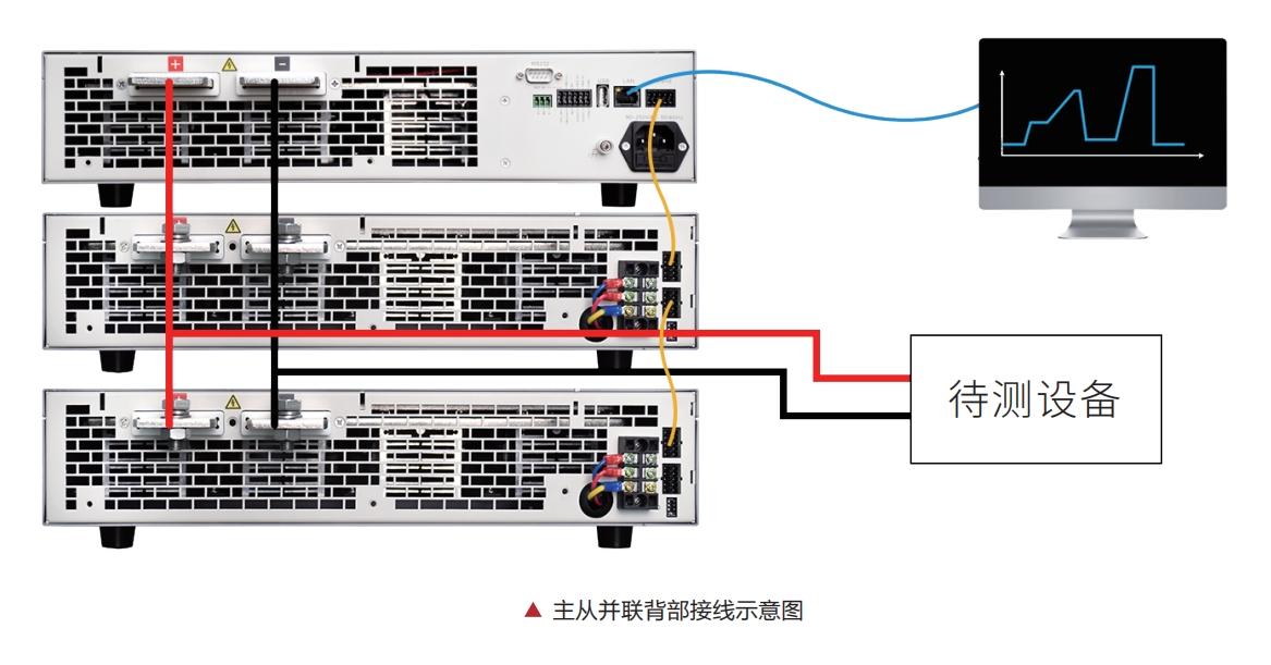 N67000 系列支持主从机并联,并可主动均流,当负载功率需求增加时,皆可通过并联的方式 ( 主 + 从 ) 达到所需的电流及功率。
