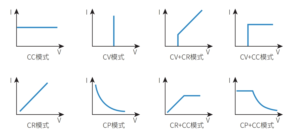 8种工作模式:CC、CV、CP、CR、CV+CC、CR+CC、CV+CR、CP+CC
