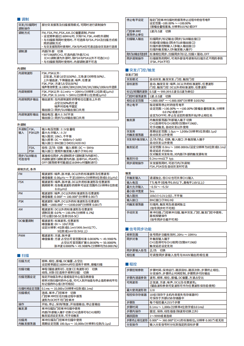 | 输入输出接地 | ·波形输出、同步/SUB输出、外调制/加法运算信号的信号 地线与机壳绝缘(同一通道内的这些信号的地线是共同的)。 ·外部10MHz频率基准输入的信号地线与机壳绝缘。 .CH1、CH2、外部10MHz频率基准输入的各信号地线相互独立。 ·耐压更大42Vpk(DC+ACpeak) |