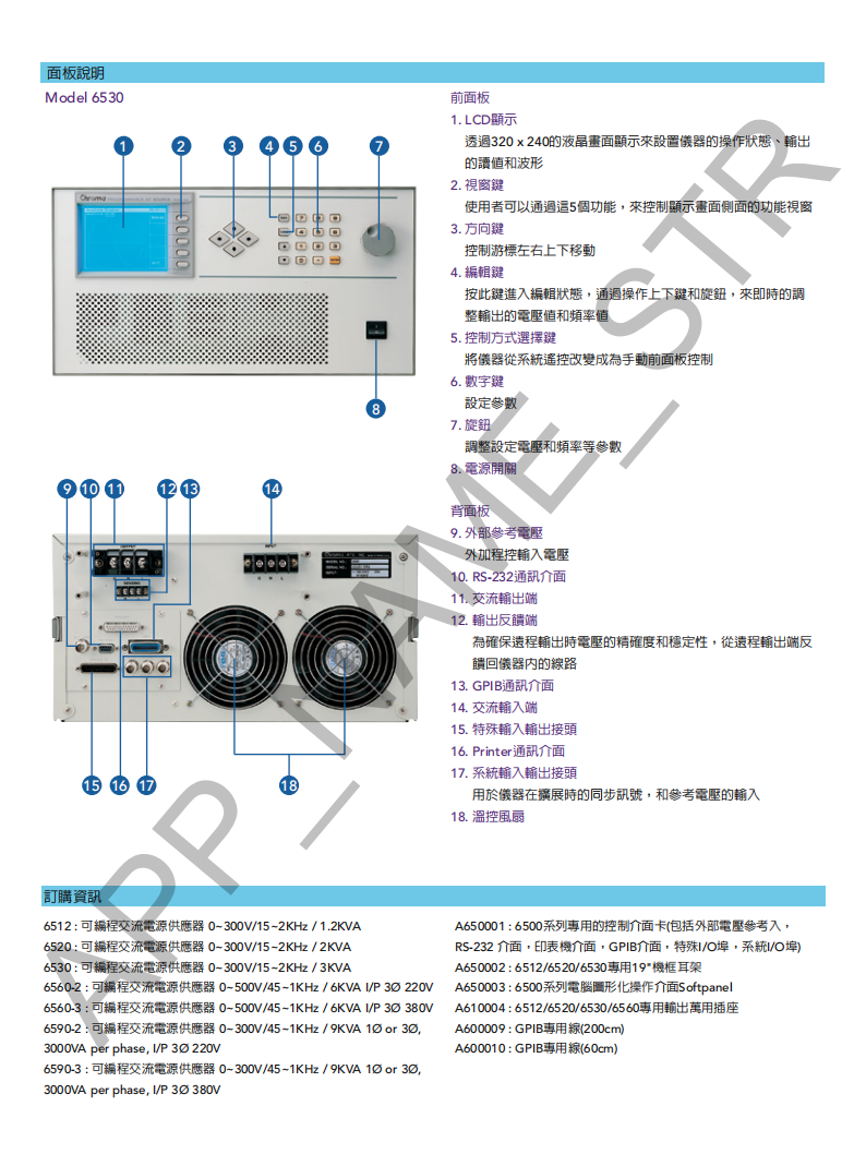 功率 : 1200VA, 1ø (6512) 2000VA, 1ø (6520) 3000VA, 1ø (6530) 6000VA, 1ø (6560) 9000VA, 1ø or 3ø (6590)