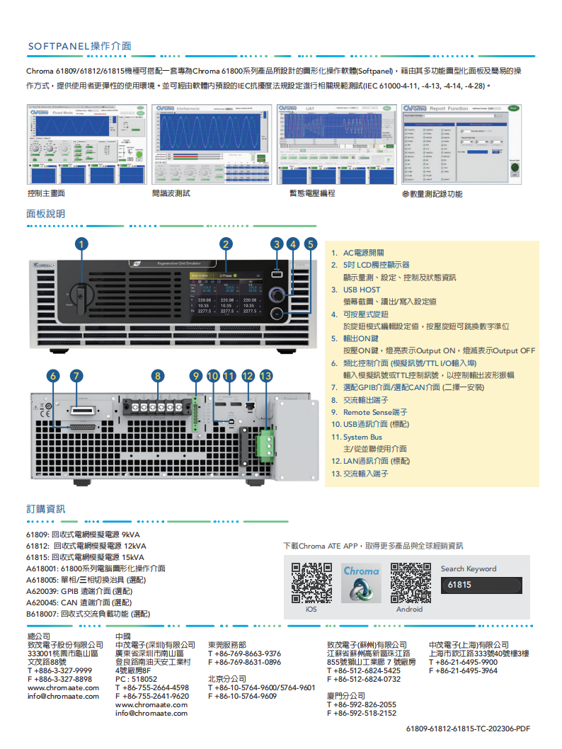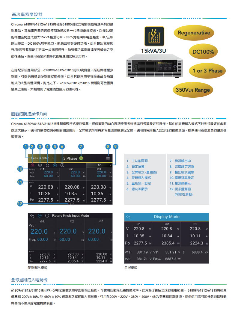 61809/61812/61815 机型为 Chroma 61800 回收式电网模拟电源系列中,功率分别为 9kVA/12kVA/15kVA 的电源测试仪器产品。该机型以 3U 的机体高度具备更大 15kVA 的输出功率,实现了高功率密度设计;并且具有单相、三相输出模式;输出电压范围可达到相电压 350V、线电压 606V,通过单相三线配置可达到单相电压 700V;此外,更能够通过主从控制实现多台单机并联组合,提供更大的输出功率以满足测试需求。