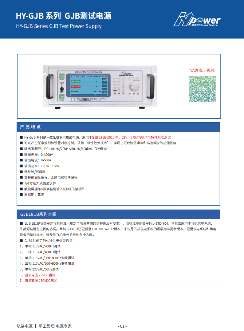 HY-GJB系列是一款GJB专用测试电源,适用于GJB 181B-2012中,28V、270V飞机供电特性标准测试