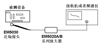 探头通过50Ω的电缆直接与频谱仪或者示波器连接。当产品的辐射或传导干扰超过标准时,可用近场探头来寻找产品中哪个元件或电路产生了该频率的干扰,能够检测模块之间的耦合通道以及评估系统内信号切换速率、RF电压等。当干扰信号比较弱时,可以配合本公司的EM5020A(20dB增益)或者EM5020B(30dB增益)前置射频射频放大器可以提高系统测试灵敏度。