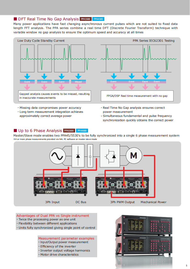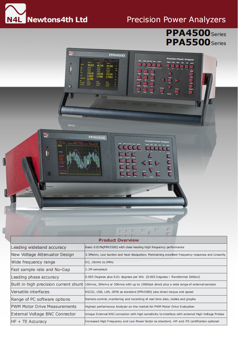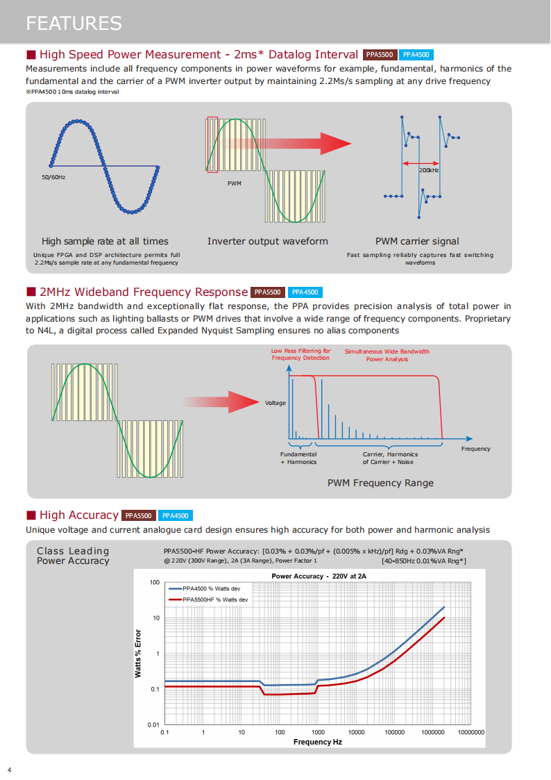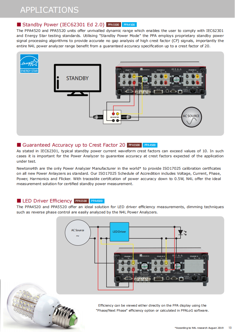The PPA4520 and PPA5520 units offer unrivalled dynamic range which enables the user to comply with IEC62301 and Energy Star testing standards. Utilising"Standby Power Mode" the PPA employs proprietary standby power signal processing algorithms to provide accurate no gap analysis of high crest factor (CF)signals, importantly the entire N4L power analyzer range benefit from a guaranteed accuracy specification up to a crest factor of 20.
