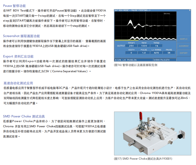 Chroma 19301A在自动化生产上应用,拥有超高速测量速度,有效缩短测试时间,提升生产效率,且电压补偿功能改善了自动化机台配线等效电感的影响。