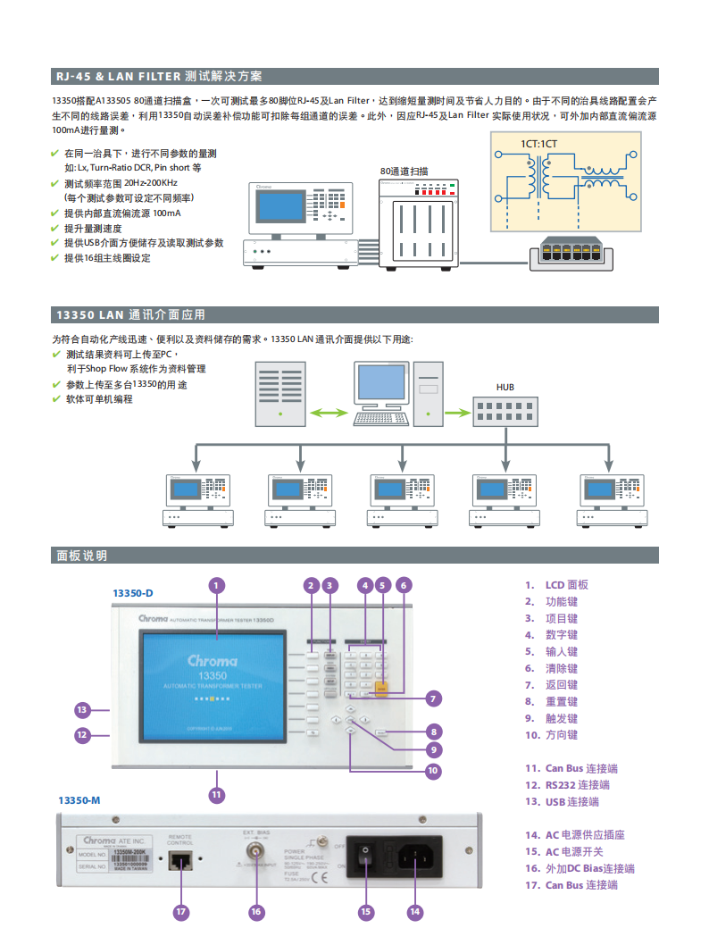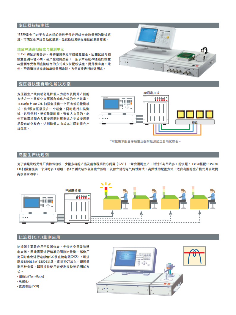 13350 新一代的自动变压器测试器,借由多年市场经验与成果累积,除了保留旧款3250原有的优点之外,更增加许多新的功能。包含结合量测单元与扫描测试盒,降低长配线造成的损失,提升量 测精度、支援比流器(C.T.)量测治具、支援80 /20通道扫描盒、USB设定参数储存介面、LAN通讯介面、测试频率/电压/速度个别设定、不良判定锁住功能(Fail Lock)、自动量测功能(Auto Test)等,解决目前变压器产业因产能,产线人为错误以及产品品质所带来烦恼。