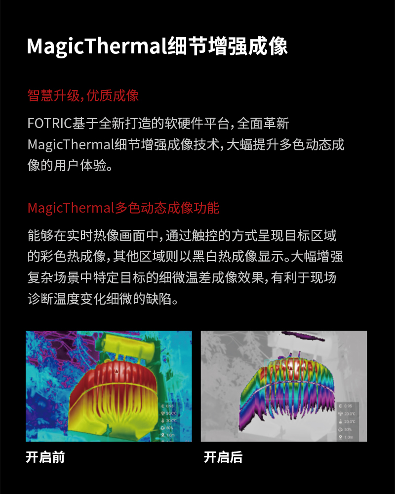 | MagicThermal | 开启MagicThermal,能够在实时热像画面中,通过触控的方式呈现目标区域的彩色热成像,其他区域则以黑白热成像显示 |
