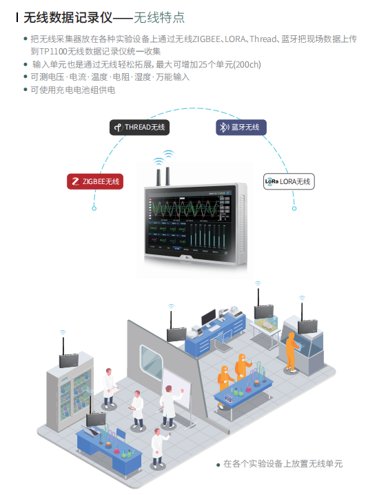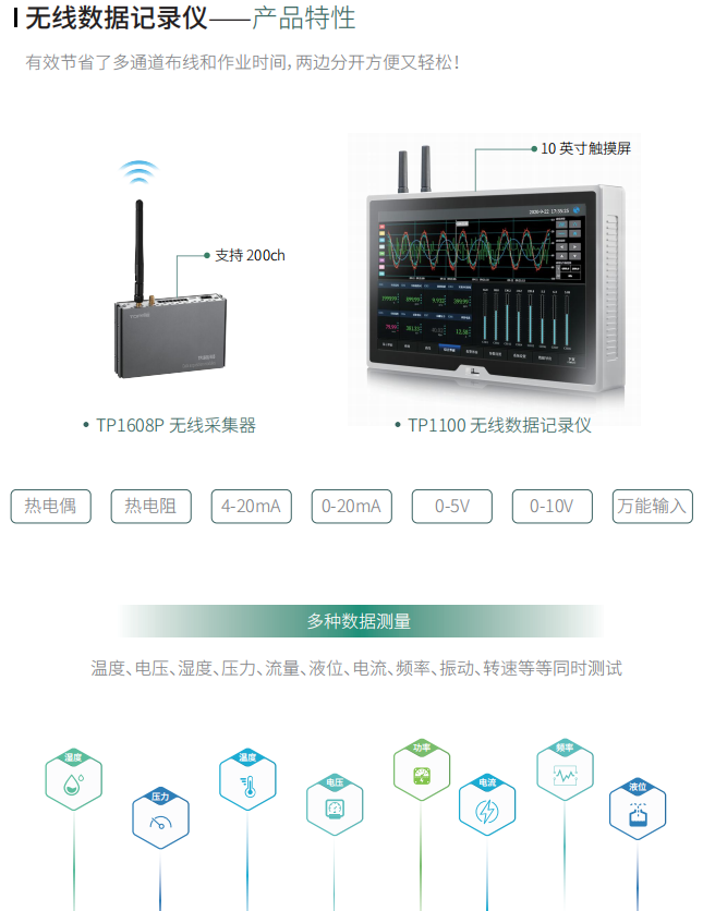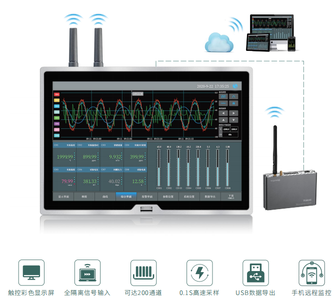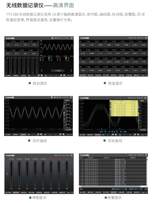 TP1100 无线数据记录仪采用10英寸触屏高清显示,数字图、曲线图、柱状图、报警图、历史数据总览等,界面简洁直观,设置操作方便。