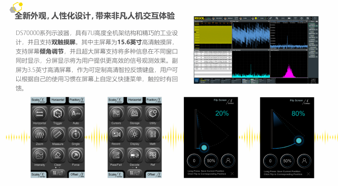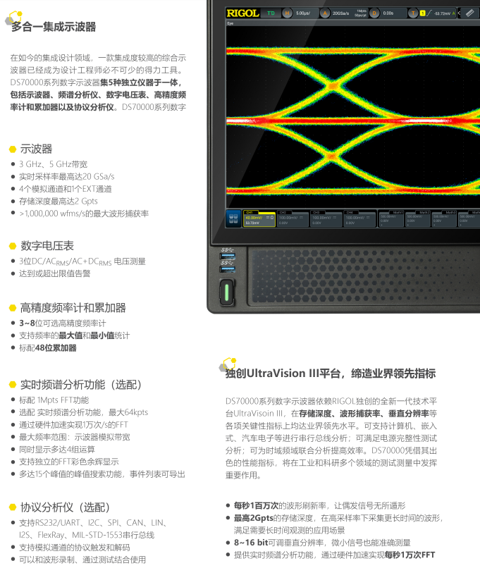 DS70000 系列数字示波器充分发挥了 RIGOL 自主设计的“凤凰座”示波器专用芯片组卓越性能,实现了最 高 20 GSa/s 采样率、5 GHz 带宽。依赖 RIGOL 独创的 UltraVison III 全新技术平台,实现了 100 万次/秒 刷新率、2 Gpts 存储深度、8 bit ~ 16 bit 可调分辨率模式,各项指标均达到业界领先水平。除了硬件指标 的提升,DS70000 系列数字示波器还配备了倾角自动可调的 15.6 英寸的高清触控大屏和高清智控反馈键盘 等多种人性化设计,为用户带来非凡的人机交互体验。