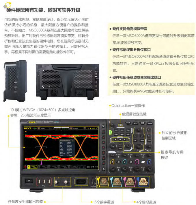MSO8000A系列数字示波器使用了RIGOL“Phoenix”(凤凰座)数字示波器芯片组,不仅获得了10 GSa/s的数据采集能力,还实现了模拟前端所需的所有功能模块的高度集成,极大地提高了数字示波器的一致性和可靠性。并基于创新性的UltraVisionl技术平台,具有更高的波形捕获率、全数字触发技术和全内存硬件测量技术。MSO8000A系列数字示波器又同时集成了多个仪器模块,如MSO、任意波发生器、数字电压表、6位频率计和累加器以及协议分析仪,为用户带来超凡的性价比体验。