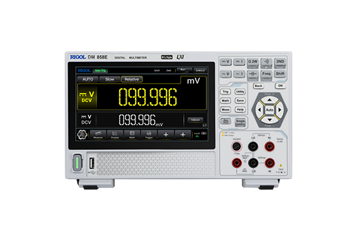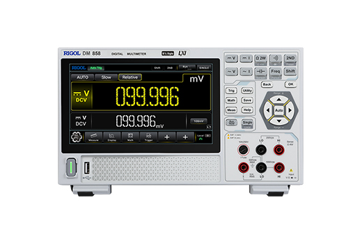 DM858 系列台式数字万用表提供了性价比超高的测量工具。它具备 5.5 位分辨率、更高 125 个读数/秒、 500,000 数据记录存储器、0.03%的 DCV 年准确度特性,包含 11 种输入信号测量、5 种数学运算与 3 种图 形显示,满足实验和测试工作中的大多数对万用表的需求。7 英寸触控大屏,测量结果可清晰观测,标配 USB、LAN 接口,支持 Webcontrol,提供了直接的仪器操控方式,人机交互更便捷。同时使用 Type-C 接 口供电,体积小巧超薄,并支持桌面支架,完美节省工程师的工作台空间。