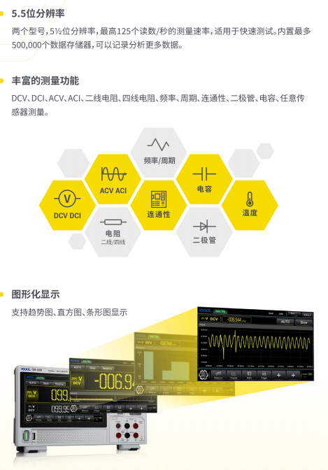两个型号,5½位分辨率,更高125个读数/秒的测量速率,适用于快速测试。内置最多500,000个数据存储器,可以记录分析更多数据。