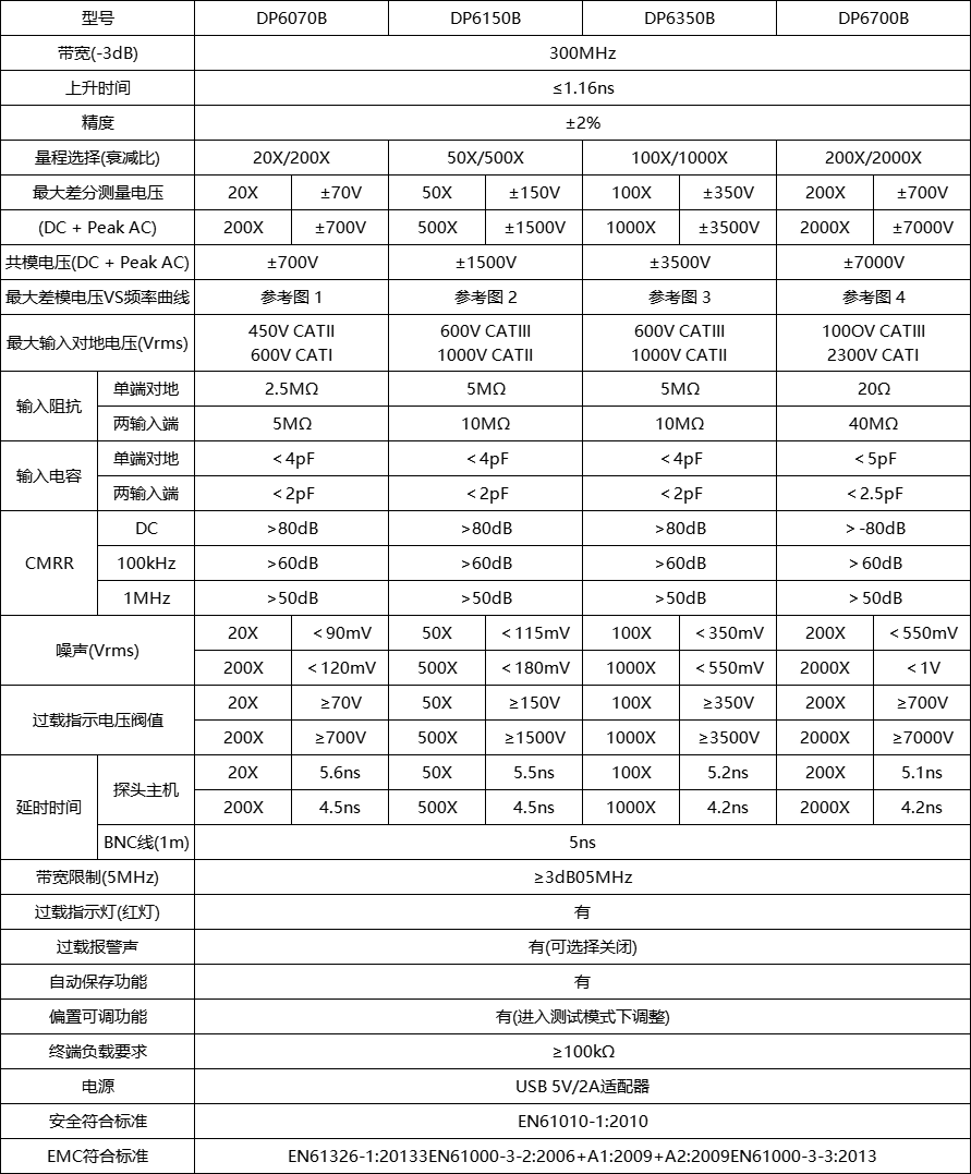 DP6000B系列高压差分探头是具有浮地测量功能的高压差分探头。其带宽更高达到300MHz,满足了大部分测试系统的需要。丰富的量程可供选择,其差动测量电压范围满足大部分测试电路的要求。探头长期使用后若出现失调现象,用户可进入测试模式,调整偏置,实现归零;电子轻触式按键,使得使用寿命更长。具有5MHz带宽限制功能选择,5MHz频率带宽满足大部分开关电源中FETs的开关频率的测量,并可以滤除更高频率的噪声和干扰。带有声光报警功能,且可手动关闭声音报警功能,更具有人性化设计。