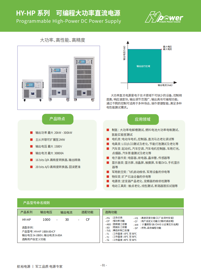 大功率直流电源是电子技术领域不可缺少的设备,控制精度高,响应速度快,输出调节范围广,输出具有可编程功能,通过不同的控制可适用于多种场合,操作便捷智能,满足多种电性能测试需求。