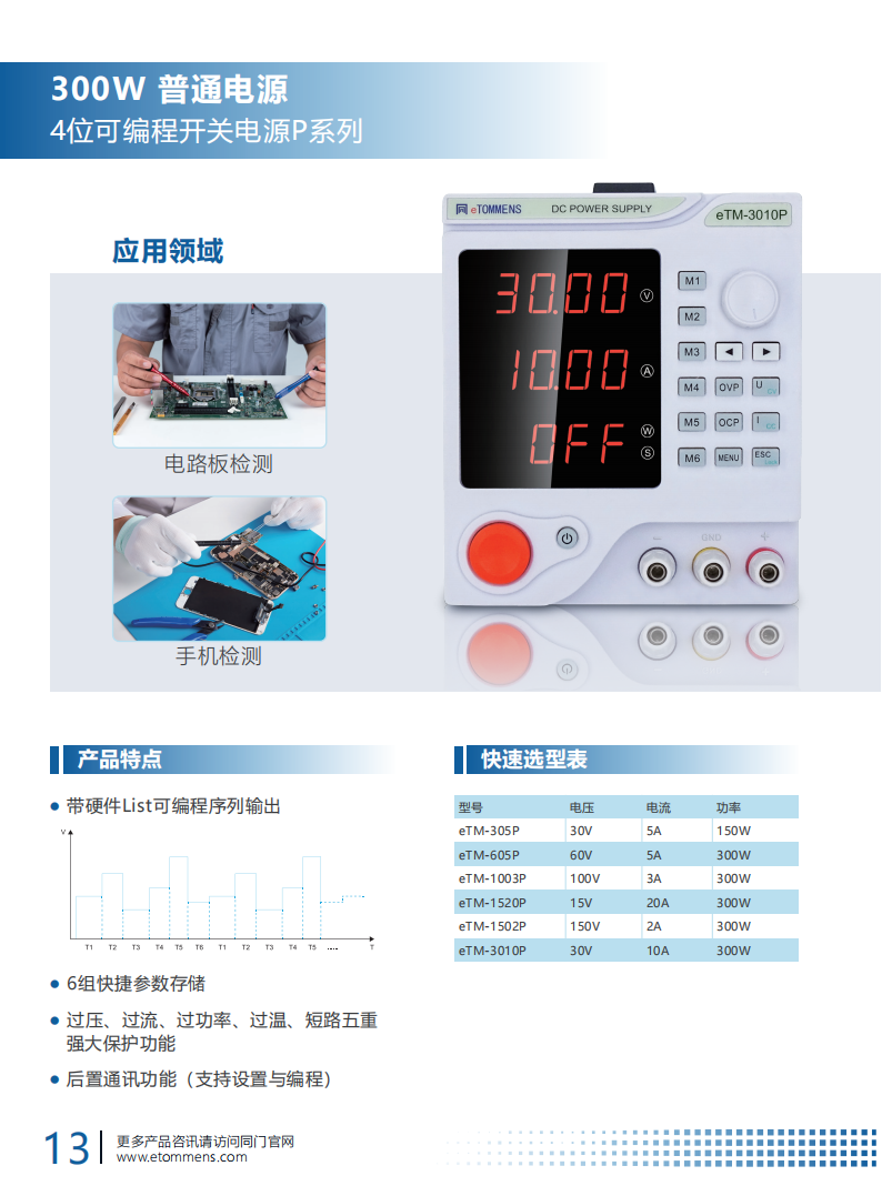 300W 普通电源 4 位可编程开关电源 P 系列优势突出。其具备 4 位高精度数字显示,输出电压、电流状况一目了然。编程功能强大,可依需求灵活设定参数,适配多元场景。拥有出色的稳定性与可靠性,面对复杂用电环境也能稳定供电,全方位为设备运行护航 。