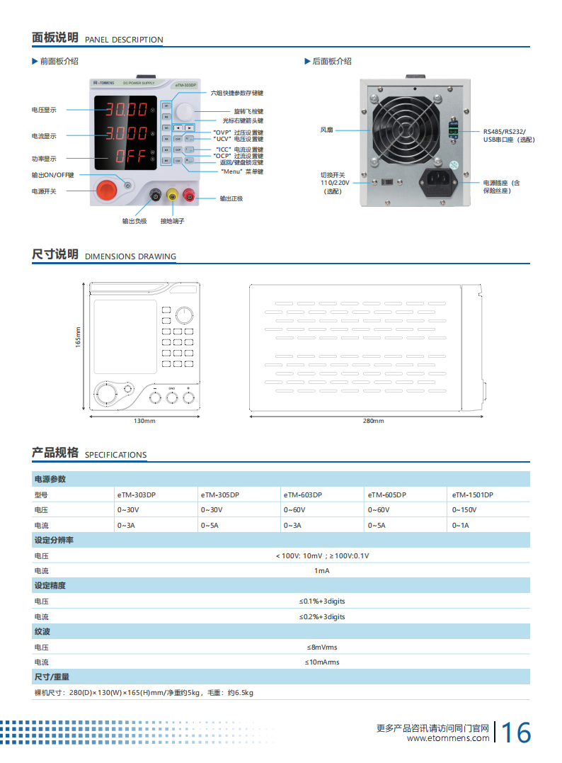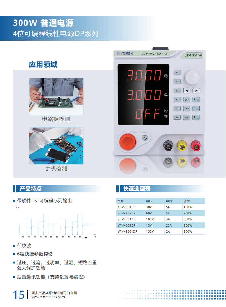 300W 普通电源 4 位可编程性电源 DP 系列优势显著。采用纯铜环型变压器,高效且发热小。具备 10mV/1mA 高精度分辨率,LED 直观呈现电压、电流与功率。设有短路、过压等多重保护,稳定性强。还有一键控制输出通断开关,操作方便又安全 。