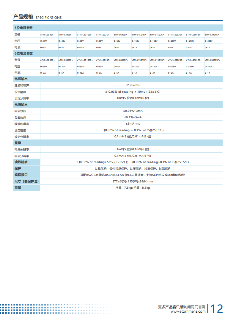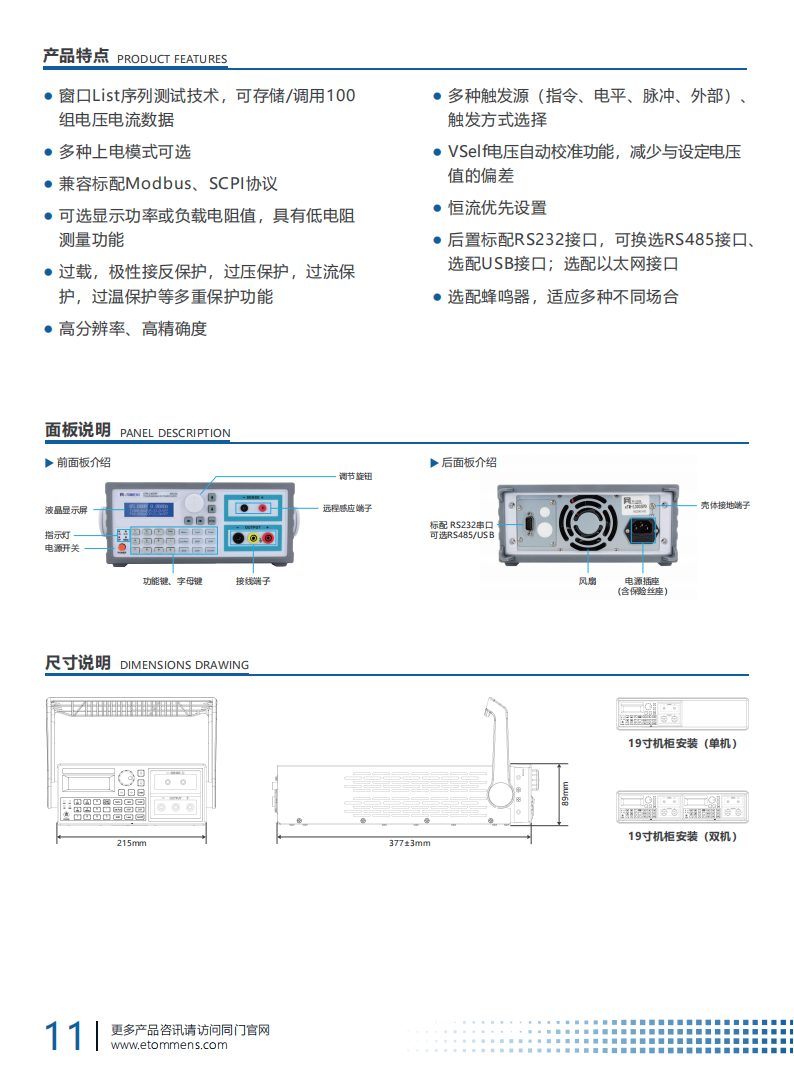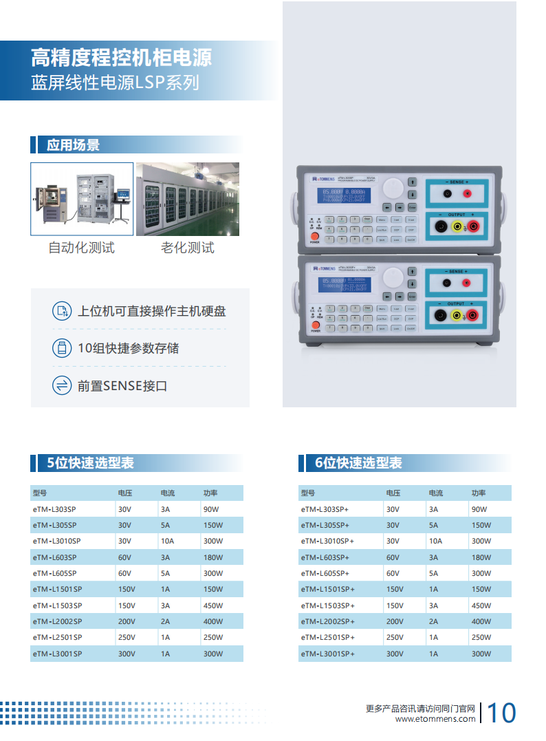高精度程控机柜电源蓝屏线性电源LSP系列优势显著。采用高品质纯铜环型变压器,纹波小、稳定性强。122x32的LCD显示器可全面展示电源状态,5至6位分辨率达0.1mV/0.1mA或0.01mV/0.01mA 。它支持100组设定存储与调用,具备多重保护及一键锁定,还标配RS232接口,适配多种编程指令集 。