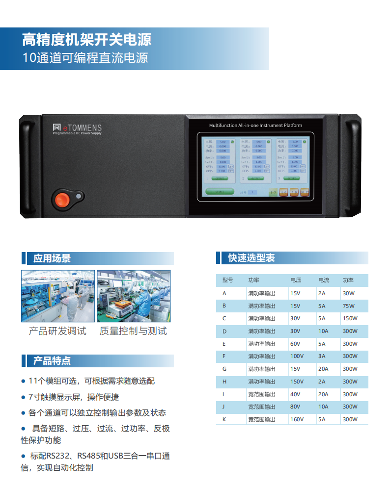 高精度机架开关电源 10 通道可编程直流电源,亮点鲜明。10 通道设计,可同时为多设备供电,适配复杂用电场景。电压、电流调节精度极高,输出稳定,能满足对供电质量要求严苛的设备需求。具备编程功能,可依需求灵活设定参数。内置多重保护,全方位保障设备安全运行
