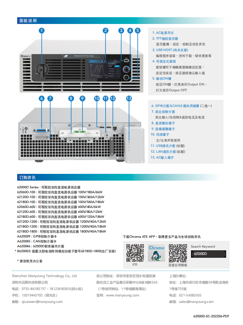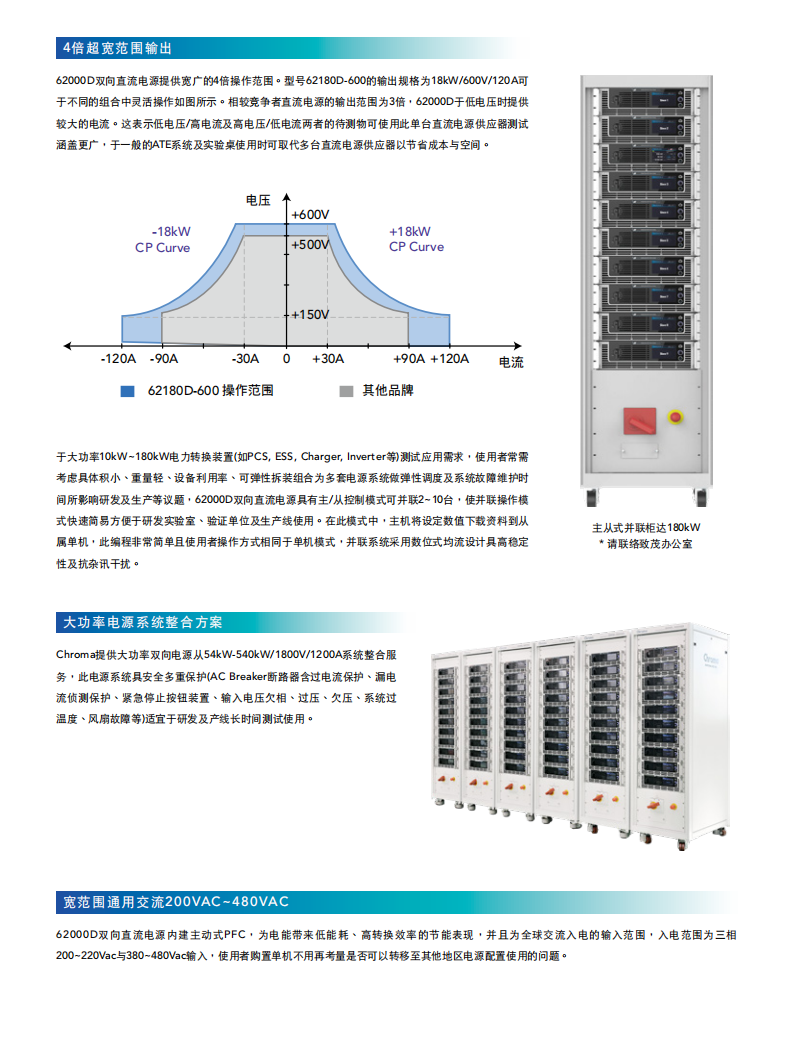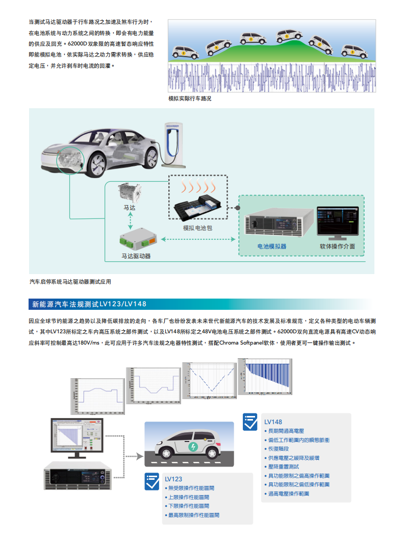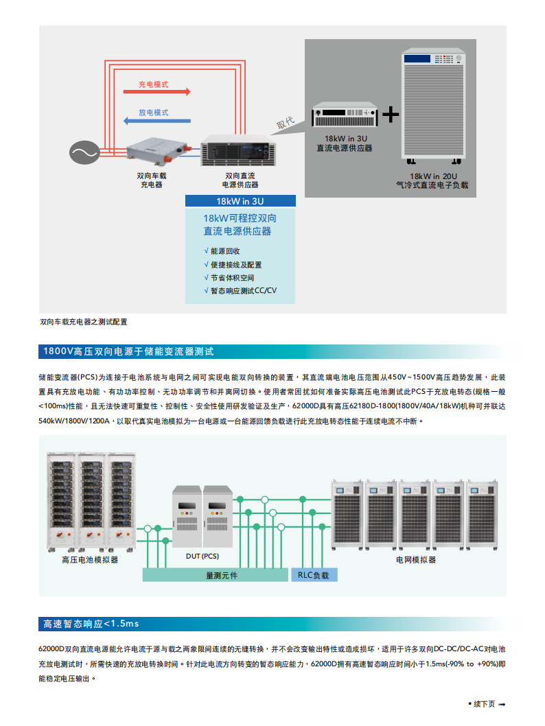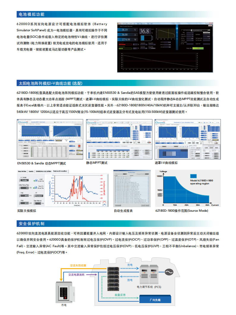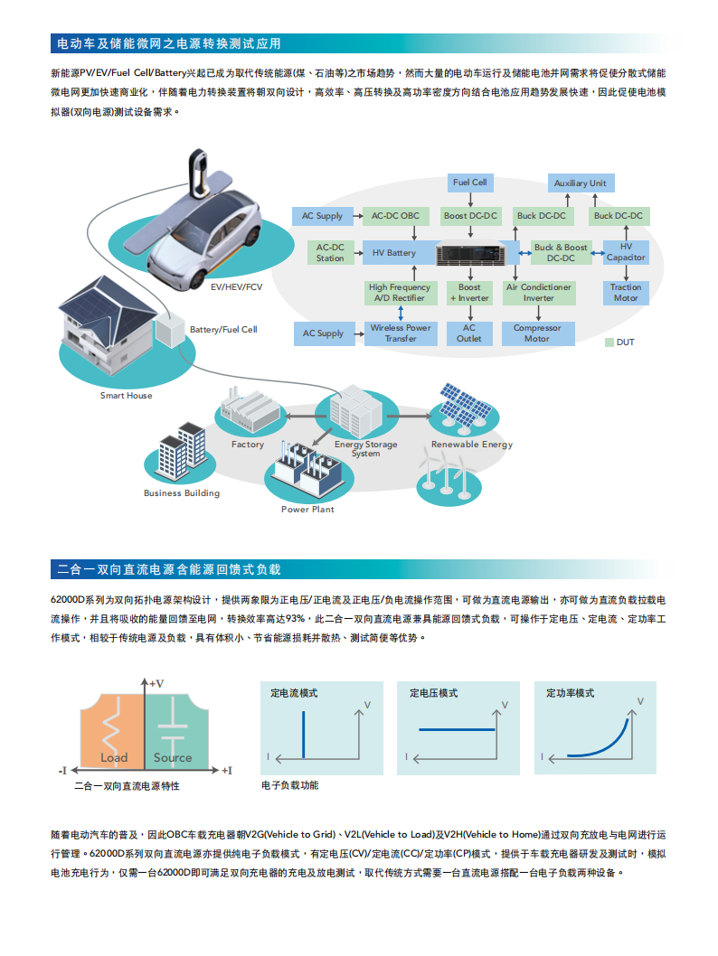 Chroma 62000D 系列可程控双向直流电源供应器兼具电源及负载特性,能进行双象限操作,可允许待测物的能量回馈到该电源中。它适用于新能源储能系统的测试,比如光伏 / 储能混合式逆变器、电池储能变流器(PCS)等,可用于模拟储能电池的充电与放电转换过程。62000D 同样适用于新能源汽车相关应用,如双向车载充电器(BOBC)、双向直流转换器、DC-AC 电机驱动器等电源管理系统,通过该电源供应器来替代电池,实现双向的电源转换模拟测试。