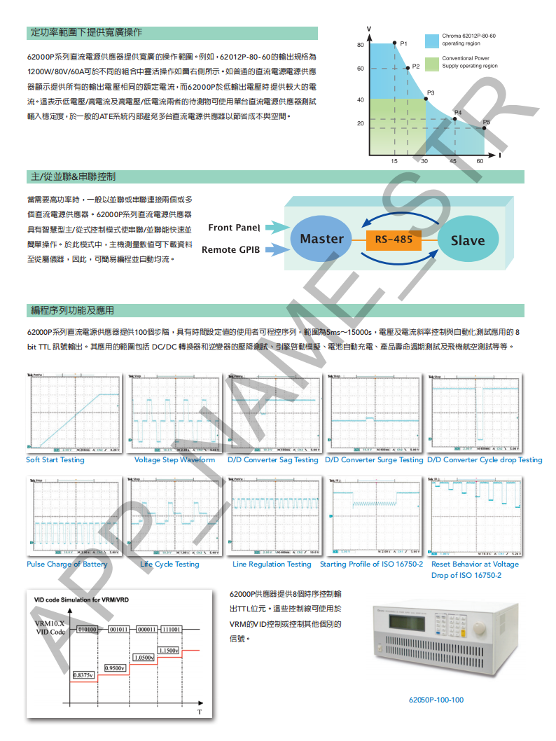 Chroma 62000P 系列可程控直流电流供应器,为 ATE 整合与测试提供了许多独特功能。这些功能涵盖定功率操作范围、精准的输出电流和电压量测、输出触发信号,以及能够模拟复杂的直流暂态波形,以便对设备的瞬断、压升及其他电压间偏差进行测试。62000P 是高准确度可程控直流电源供应器的新标准,专门为 D2D 转换器和其他类似产品的自动化测试而设计。